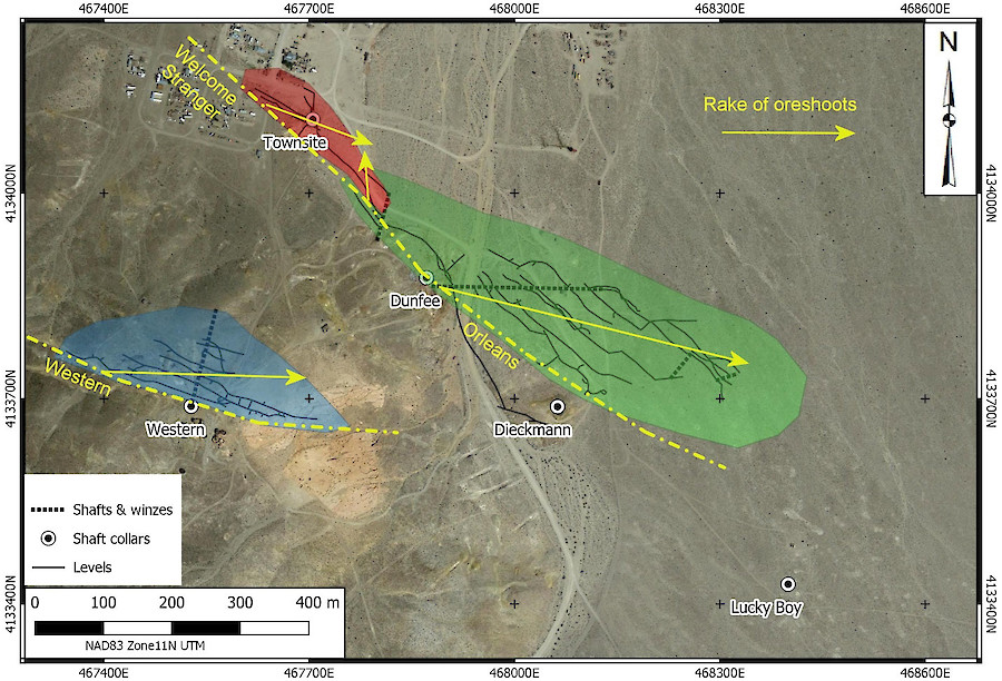 The Gold Point area is underlain by Precambrian Wyman Formation fine-bedded clastics and carbonates and by Reed Dolomite, intruded and tilted to the NE by an ESE trending finger of the Jurassic Sylvania Pluton. Precious metal mineralization is hosted in branching and anastomosing WNW striking, moderately NNE dipping veins and breccias in the Wyman Formation. Ore shoots within these systems dominantly rake to the east in the plane of the structures. The host veins consist of crushed, coarse crystalline quartz with hematite and limonite. Silver mineralization is shallow and hosted in chlorargyrite and rare bromyrite. Gold is associated with pyrite, galena and cerussite, persisting to a depth of at least 1,020’ below ground level. The principal veins in the Gold Point area are the Grand Central – Western vein system and the Welcome Stranger (Townsite) – Orleans vein system to the northeast. The veins range up to 9 m in width (Orleans Veins) and the major vein systems were defined on strike at surface for nearly a kilometer.